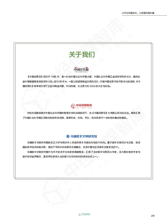 “本报告”以腾讯、蚂蚁集团、淘天集团、百度等2023年中国互联网协会公布的百强互联网企业为研究对象,通过定向问卷调研、查阅企业披露的ESG报告或财报中有关ESG或社会责任、可持续发展相关章节、访谈等形式相结合的方式撰写完成。乌镇数字文明研究院与《中国经营报》、中经传媒智库开展此项报告工作已至第二年,持续关注并发布此报告不仅能够为行业发展提供长期的、连贯的数据支持,还能基于历年的分析对比,更精准地把握市场动态和趋势变化,为相关决策提供坚实依据。