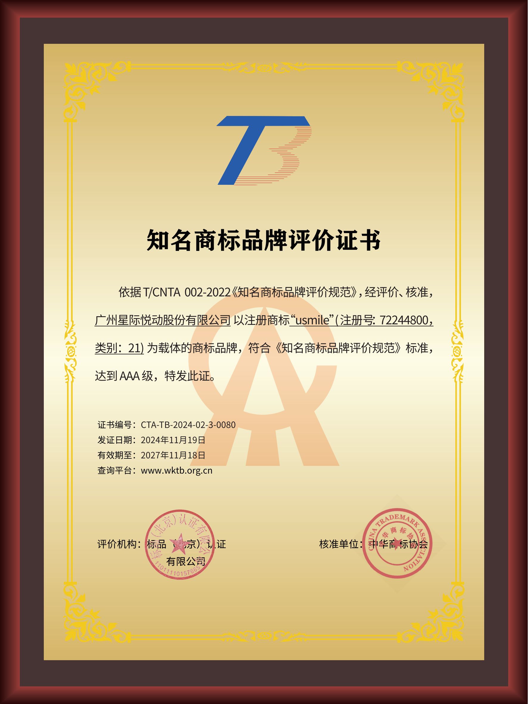 近日,专业口腔护理品牌笑容加的母公司——广州星际悦动股份有限公司所持有的“usmile”注册商标,在第14届中国国际商标品牌节上,成功通过第21类商标认证,荣获“AAA级知名商标品牌”称号,标志着usmile笑容加在电动牙刷领域中率先获得了这一国家级品牌认证。