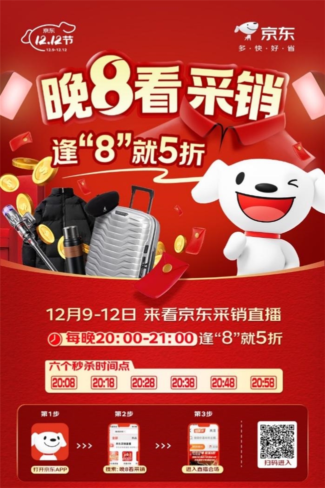 无论是低价爆品还是叠加红包的超值优惠,“晚8看采销、逢8就5折”都将在12月9日至12月12日点燃消费者购物热情。锁定活动期间每晚8点的京东采销直播间,五折爆款限量放送、百万红包惊喜连连,抢购狂欢不容错过!