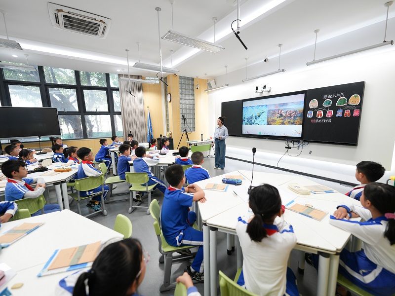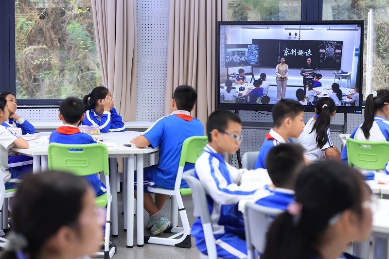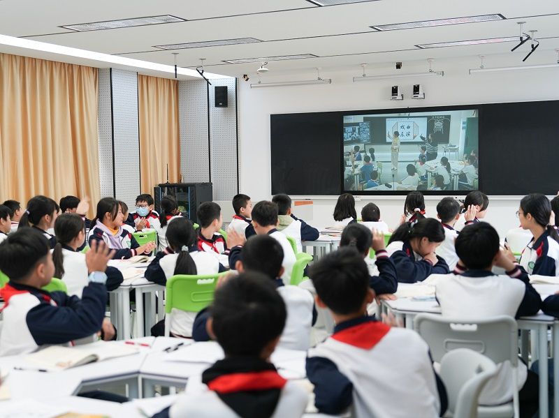 12月5日,广东深圳南山二外(集团)海德学校、赤湾学校、河源连平县元善镇小学和第十八小学四所学校在“TCL智慧教室”开展跨学科融合联动课堂,175名来自不同地区的学生跨屏相见,通过“1+N”智慧网络同上一节课,共享优质教育资源。