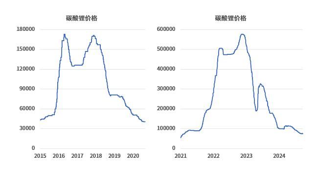 除了价格振幅更大,2020~2024年的这一轮锂价升降周期,与2015年到2020年的大走势如出一辙:平稳上涨、快速突破历史高位、缓慢下降,直至下一次上涨。