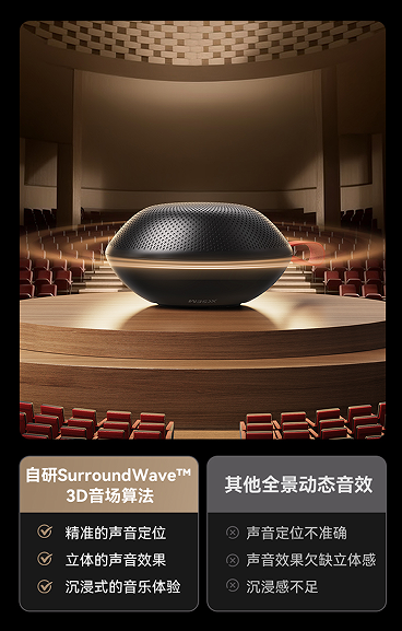 除了卓越音质之外,更在人性化智能设计方面展现了独特的优势,音响采用了自主研发的SurroundWave 3D音场算法技术,这一技术通过对音频各个点位的频率和特性进行深入分析,精确计算出声音的定位、距离和角度,从而实现对声源位置的精准模拟。无论是观看电影、玩游戏还是欣赏音乐,用户都能感受到仿佛置身于音乐会现场的真实感。