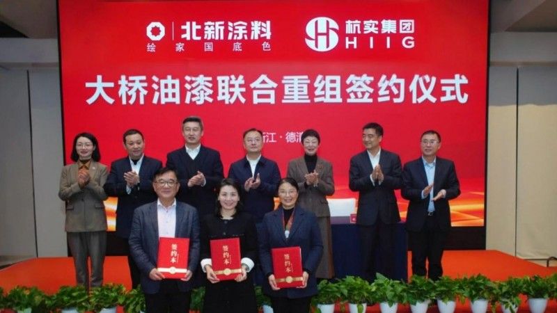 12 月 12 日,在积极贯彻落实中央经济工作会议精神的背景下,北新涂料联合重组浙江大桥油漆有限公司(简称大桥油漆)签约仪式在浙江德清举行。北新建材党委书记、董事、总经理管理,杭州市实业投资集团有限公司党委副书记、副董事长、总经理郭东晓出席仪式并讲话。亚洲涂料油墨联合会主席孙莲英,北新建材副总经理王帅、总经理助理兼投资发展部总经理丁尚华,杭州产权交易所有限责任公司董事长、总经理钟伟,德清县人民政府副县长施敏丽出席仪式。北新涂料董事长、总经理陈燕,杭州市实业投资集团有限公司副总经理盛晓瑾,大桥油漆党委书记、董事长程磊楠分别代表三方签署协议。