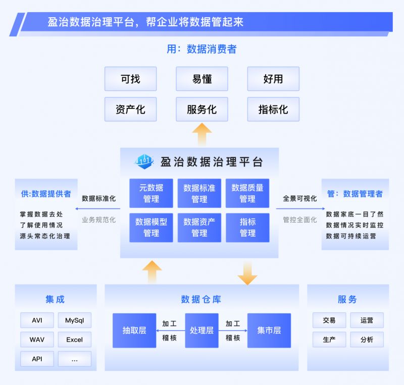 盈治数据治理平台——企业数据建设、治理、运营一体化平台。帮助数据提供者掌握数据去处、了解数据使用情况;帮助数据管理者了解数据家底、实现数据可持续运营;帮助数据使用者方便、快捷地挖掘数据、理解数据和使用数据,促进企业数据质量提升,加速企业数据流通共享。