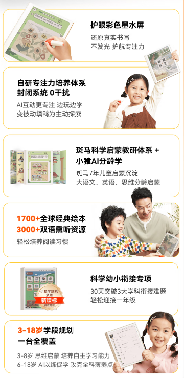对于许多家长而言,孩子在启蒙阶段的教育十分重要,儿童绘本则是启蒙教育中的重要组成部分。相比小猿学练机S2,小猿学练机彩墨版的一大亮点则是拥有红火箭、牛津树等海量顶级绘本资源,无需家长再额外挑选和购买,性价比十足还能帮家长省下不少时间。在孩子使用小猿学练机彩墨版阅读绘本时,AI小猿互动还能让孩子自主专注的持续阅读,小猿的原声阅读功能也能代替家长讲绘本,真正全面解放家长。从资源到互动再到讲解,小猿学练机彩墨版能真正做到让家长省心,让孩子专心。