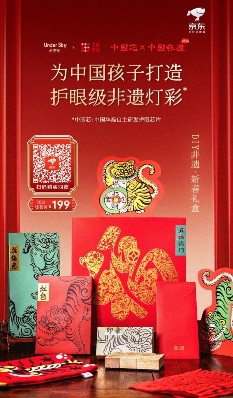 相关数据显示,市面上很多发光玩具均有不同程度的蓝光过高、眩光伤害等问题,而喜爱凑近探索的孩子们,视力更容易在不知不觉间降低。京东年货节带来的UNDERSKY天空见&王的手创联名款新年定制灯彩新品中,柿柿如意小灯笼、玲珑鱼灯均配备了中国科学院院士团队历经20年自主研发出的“中国芯”硅基金黄光2.0科技,真正实现0蓝光不伤眼。五福临门新春礼盒中,五虎灯箱配备的30颗灯珠,则升级为具有全光谱健康照明芯片的中国华磊自主研发护眼光源,让孩子在近距离观看非遗年画时也能“目浴”健康光线。