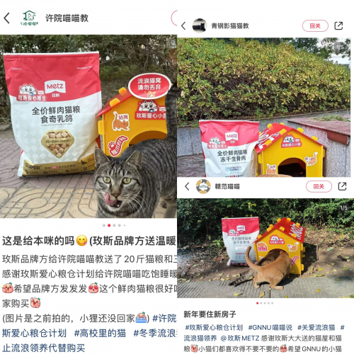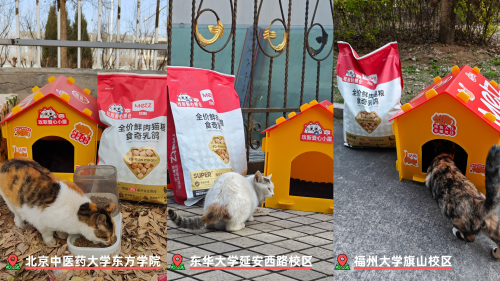 宠物品牌玫斯 METZ 深知这一现状亟待改善,自2024年 9 月起至今,联合上海外国语大学、上海政法大学、北京农业大学等全国 150 多所高校的流浪猫公益社团,开启「爱心粮仓」校园流浪动物救助公益计划。玫斯深入校园一线,调研流浪动物需求,力求为这些小家伙们提供实实在在的帮助,唤起大家对它们的关爱。