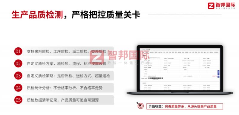 智邦一体化ERP创新推出实时质量检测与反馈机制,将质量检测融入到生产的每一个环节,实现了从“事后检测”向“事中控制”的转变。在生产过程中,系统会实时采集各个关键质量控制点的检测数据,包括原材料的进货检验、生产过程中的工序检验以及成品检验等。
