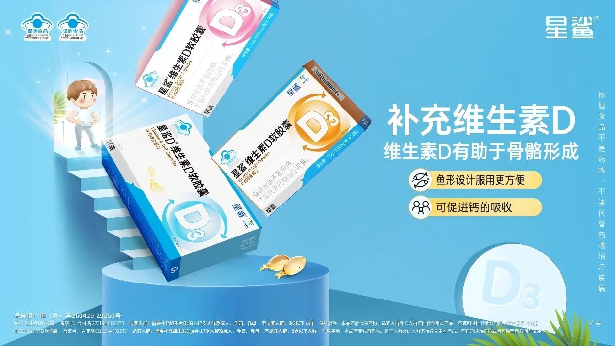 ·夯实骨骼基础:星鲨钙软胶囊与星鲨维生素D软胶囊,组合“出击”。钙软胶囊选用液体碳酸钙,高钙含量,每粒含钙248mg,既能满足妈妈因泌乳而增加的钙需求[9],也能为婴幼儿的骨骼生长提供充足营养;维生素D软胶囊,每粒含360IU维生素D3,可促进人体对钙、磷的吸收[10],达到“钙D互补”的效果。